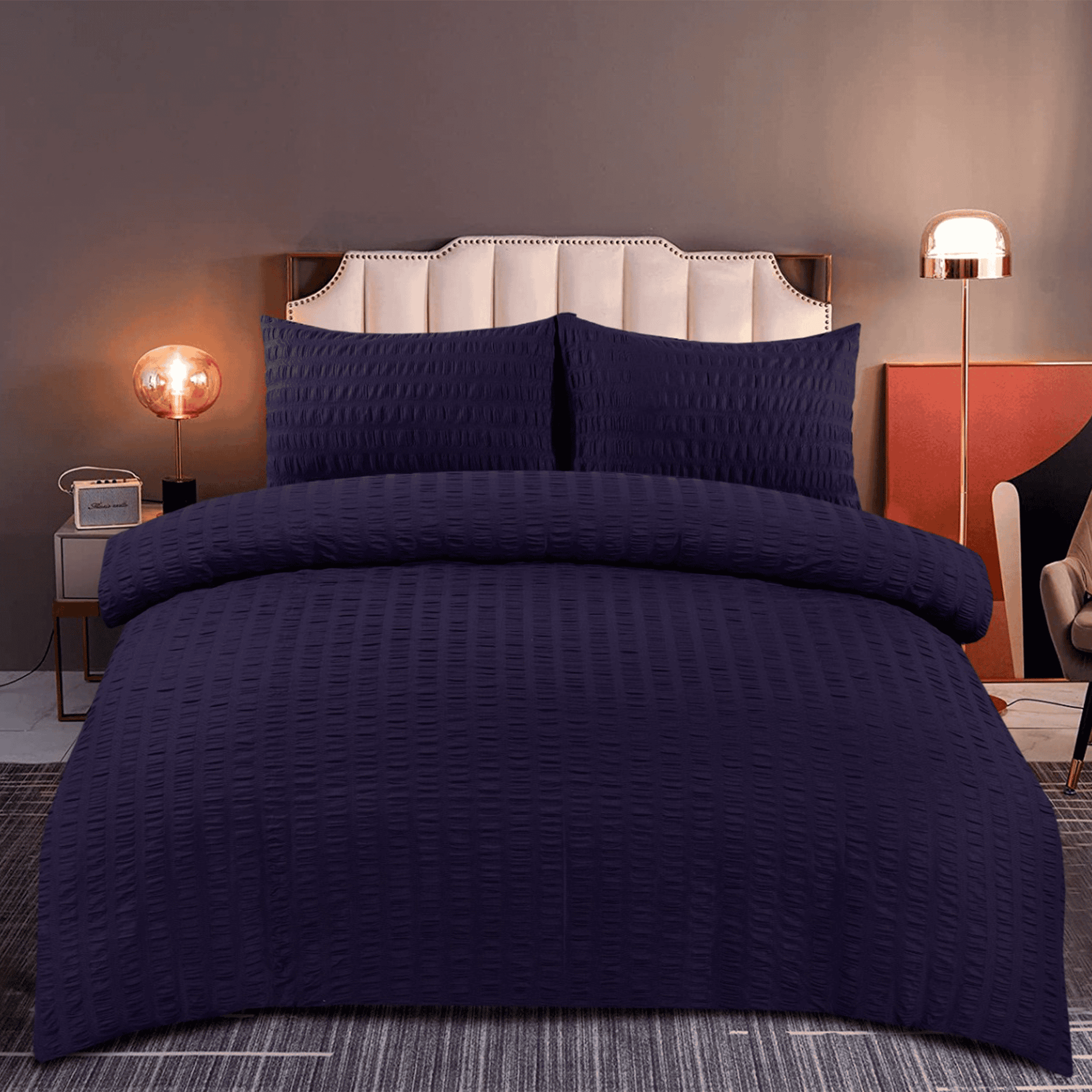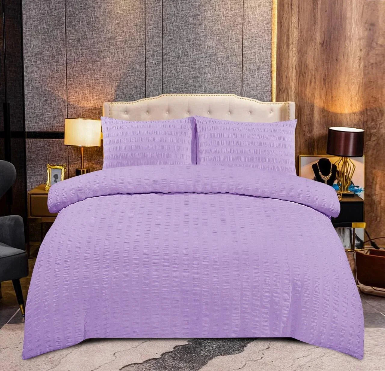 Upgrade your bedroom with the Seersucker Duvet Cover Set, a perfect blend of modern style, easy maintenance, and ultimate comfort. Transform your bedroom with the luxurious yet practical Seersucker Duvet Cover Set, designed for effortless elegance and comfort. Crafted from a premium polycotton blend (48% cotton, 52% polyester), this bedding set offers a soft, breathable feel with a wrinkle-resistant, non-iron finish for a crisp and modern look.